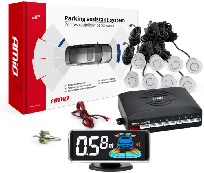 AMIO Tolatóradar Grafikus Led 3D kijelzővel 8 ezüst normál szenzorral PRÉMIUM A termék leírása A parkolási asszisztens egy olyan eszköz, amely segíti az autó parkolását és tolatását. Univerzális és bevált eszköz azoknak, akik értékelik a biztonságot az utakon. A készülék egyszerű és működőképes, automatikusan indul. Az ultrahangos szondának köszönhetően soha többé nem ütközik semmilyen tárgyba autójával. Tolatáskor vagy parkoláskor a készülék helyesen felismeri az úton lévő akadályokat, és hangjelzéssel figyelmezteti a vezetőt (az akadálytól való távolságnak megfelelő), valamint a kijelzőn is megjelennek információk, ha a készülék fel van szerelve ezzel.